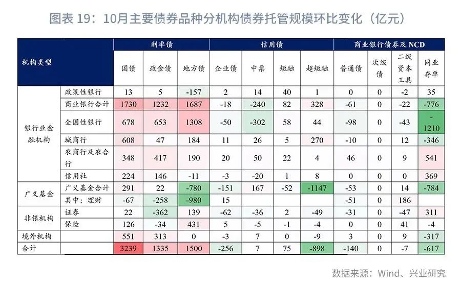 10月债市主要参与机构增配利率债,并继续减配信用债。10月利率债供给压力减弱,但利率债环比增持幅度较9月有所降低,说明市场配置动力不足。同时信用债连续第二个月出现减持,意味着收益率上行后企业债券融资受到一定影响,结合债市杠杆率降低,进一步说明债市情绪并不乐观。10 月大行、城商行、农商行、保险公司和境外机构均大量增持利率债,其中大行地方债、国债和政金债均大量增持,城商行多配国债,农商行和境外机构多配国债和政金债,保险公司偏好地方债,证券公司大量减持政金债,广义基金大量减持地方债。信用债方面,短融和超短融减持成为信用债托管量增长的主要拖累。10月同业存单发行量价态势有所放缓,但双双维持高位。10月同业存单发行量约1.9万亿元,但考虑到期量,实际净融资较为有限,说明同业存单需求有所不足。