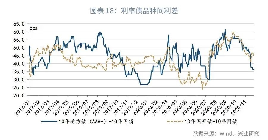 第三,10年地方债与国债利差、国开债与国债利差均缩窄。截止11月27日,较10月最后一个交易日,10年期国开债与10年期国债利差下行2bps至45bps,10年期地方债(AAA-)与10年期国债利差下行14bps至36bps。