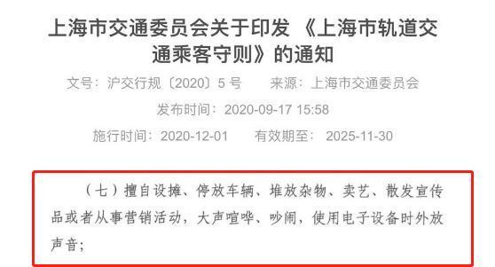 12月1日起,新修订的《上海市轨道交通乘客守则》将正式实施,其中新增了针对手机、平板、智能手表等电子设备声音外放的禁止条款。