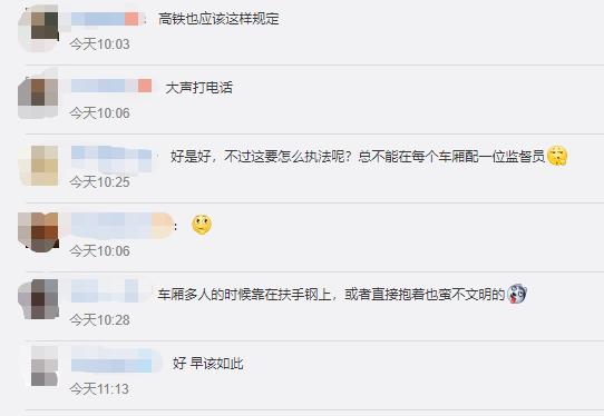 对于此事,网友们这厢热闹了,有表示强烈支持的:“早该这样了”“麻烦高铁、公交车安排一下”;有质疑实操可能性:“不可能每节车厢都有巡逻员看管吧”;有觉得这个不太合理的:“因为老人家听力不好,是否可以通融一下”……