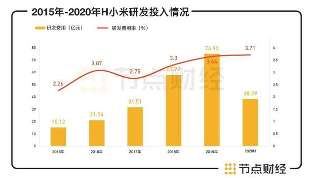 用数据佐证,公司研发费用从2016年的21.04亿元到2017年的31.51亿元,再到2018年的57.77亿元和2019年的74.93亿元,每年的增长率分别达到52.38%、81.25%和29.31%。2020年上半年,小米的研发投入为38.29亿元,同比增速达19.4%,研发费用率3.71%。