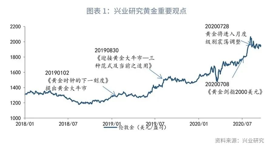 本轮黄金牛市始于2018年10月,于2019年5月进入加速阶段。在2019年1月发布的《兴业研究商品报告:黄金时钟的下一刻度20190123VIP》中,我们提出黄金将出现年度级别的牛市。从2019年初我们持续看好黄金大牛市以来,伦敦金涨幅超过60%,并于2020年8月7日触及历史新高2074美元/盎司。在《兴业研究商品报告:逼近2000美元后,金价如何演绎?20200728》中,我们提示黄金涨幅过快并逼近2000美元/盎司心理关口后,金价将出现月度级别的震荡调整(详见图表 1)。当下时点,黄金中长期上涨的逻辑已经在悄然发生变化。我们认为,2018年10月开启的单边牛市已结束,相较2011年9月至2013年2月的宽幅震荡模式,黄金此轮震荡中枢倾向于逐渐向下,直到未来联储释放收紧货币政策信号,黄金将转入熊市。
