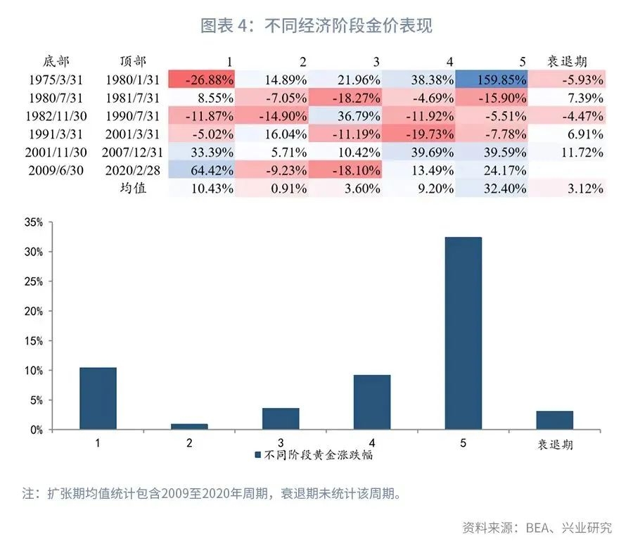 同时可以发现,在扩张后期以及复苏初期,有几个时段金价表现明显强于其余周期中的同时段,比如1975至1980年的扩张后期时段(4、5),以及2001至2007年和2009至2020年周期中的复苏初期(1)以及2001至2007年周期扩张后期(4、5)。这是因为这些时段都刚好处于由商品牛市助推的黄金大牛市中。但目前并不处于商品大牛市当中,所以当复苏渐入佳境后,黄金再走出异于同周期均值的涨幅,可能性很小,黄金在未来呈现出以往扩张期1至3时段中下跌或者横盘的概率更大(详见图表 4和图表 5)。