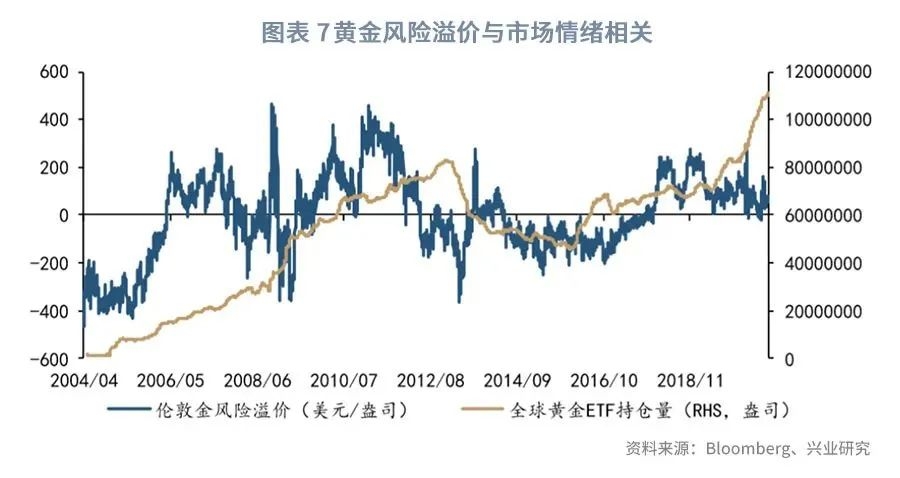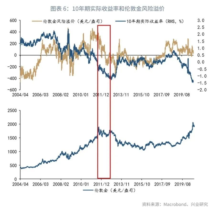 而本次,10年期美债实际收益率的低点大概率于2020年第三季度出现,未来即使回升幅度有限,也将处于缓慢上行态势。叠加资金疯狂涌入黄金市场情绪的退潮,黄金风险溢价或也将处于回落态势(详见图表 7),这使得黄金能够重现2011至2013年当时宽幅震荡的可能性极大降低,黄金呈现震荡回落的可能性增大。在美国大选后金价消化美债收益率阶段性反弹以及溢价回落的利空后,可能会因为通胀的后续回升呈现阶段性的反弹,但这个下跌后反弹的波段与2011至2013年间因为实际利率与黄金相对实际利率溢价此消彼长而呈现出的震荡存在驱动上的区别。