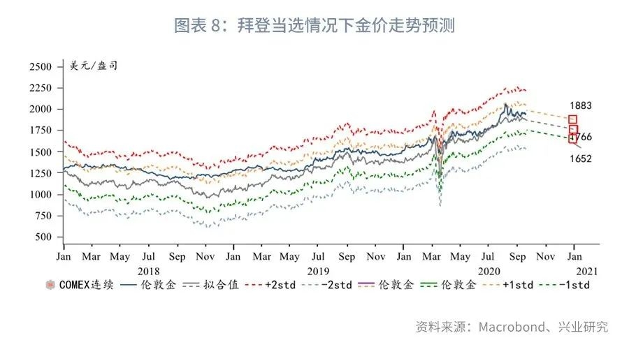 拜登当选后:假设不确定性略有下降,年内10年期美债收益率区间为0.87%至1.46%,中枢1.17%。相应的50%置信区间下,金价区间为1652至1883美元/盎司,中枢为1766美元/盎司。