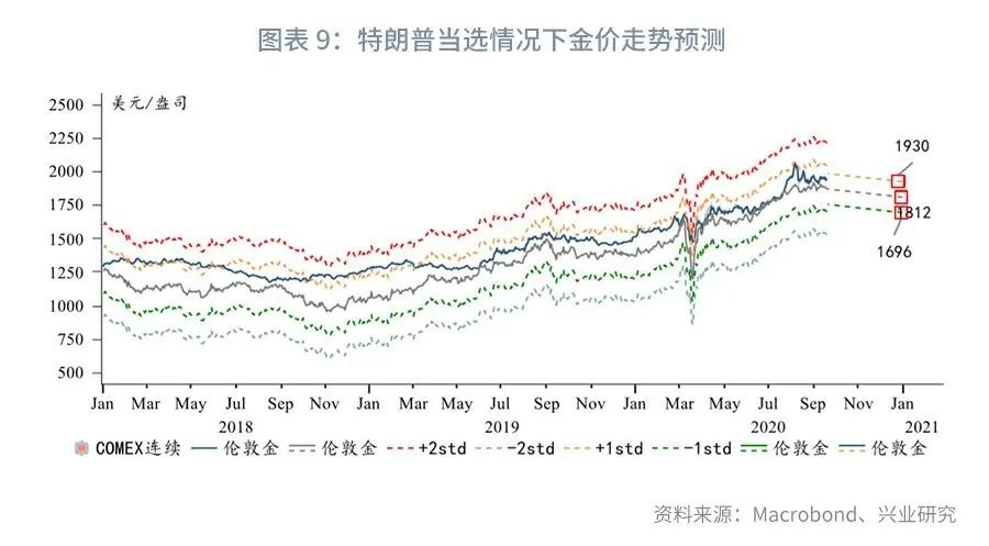 按照目前10年期美债实际收益率测算,在黄金风险溢价为0的情况下,伦敦金合理定价为1872美元/盎司,这也是在近期美债收益率并未出现上行的情况下,金价多次测试此支撑位而下破无果的重要原因。根据《兴业研究汇率报告:关注美债利率上行风险——基于三因子模型测算20200904(PRO)》中测算的未来10年期美债收益率走势,同时考虑下半年通胀预期将处于震荡持平状态的情况,我们测算拜登和特朗普当选两种基准情形下年内金价走势。