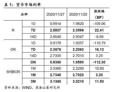 本周流动性跟踪 央行继续投放逆回购,银行间资金利率短端大幅下行。11月27日,相较于上周五(11月20日,下同),银行间质押式回购利率方面,R001下行109.06BP,R007上行22.41BP,R014下行8.99BP。存款类质押式回购利率方面,DR001下行110.79BP,DR007上行16.13BP,DR014上行3.25BP。SHIBOR隔夜利率大幅下行。11月27日,SHIBOR隔夜为0.8360%,下行112.30BP;SHIBOR1周为2.3360%,上行10.80BP;1月期SHIBOR报收2.7340%,上行3.20BP,3月期SHIBOR报收3.1360 %,上行11.50BP。