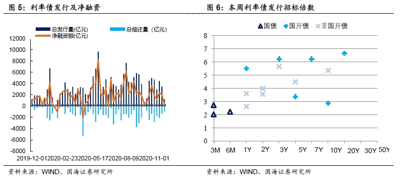 本周央行继续加大流动性投放。本周央行共投放4300亿元逆回购。其中周一(11月23日)有400亿元7天逆回购,周二(11月24日)有700亿元7天逆回购,周三(11月25日)有1200亿元7天逆回购,周四(11月26日)有800亿元7天逆回购,周五(11月27日)有1200亿元7天逆回购。本周共有3000亿元央行逆回购到期,全口径公开市场操作实现净投放1300亿元。下周央行公开市场将有4300亿元逆回购到期,其中周一至周五分别到期400亿元、700亿元、1200亿元、800亿元、1200亿元。