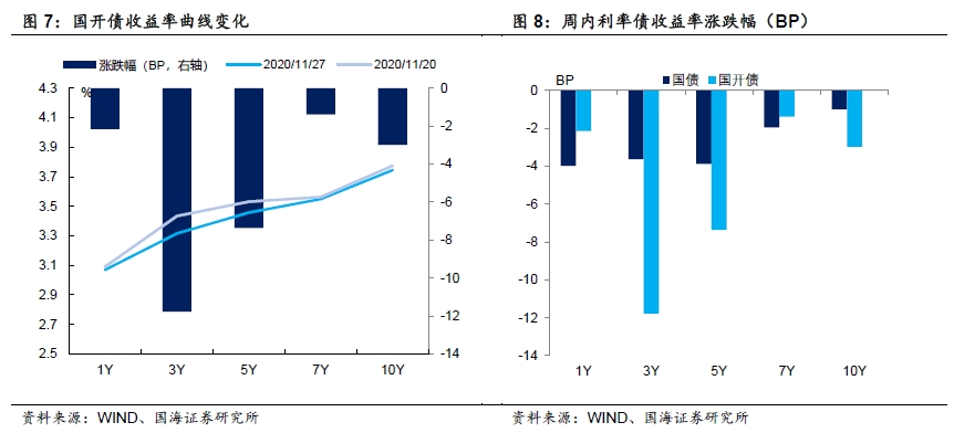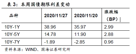 各期限利差全线走阔。11月27日,与上周五相比,10Y-1Y利差走阔2.99BP,10Y-5Y利差走阔2.88BP,10Y-7Y利差走阔0.96BP。