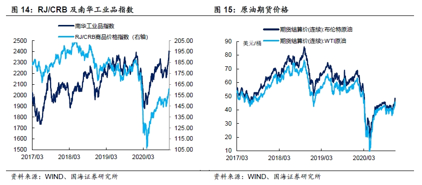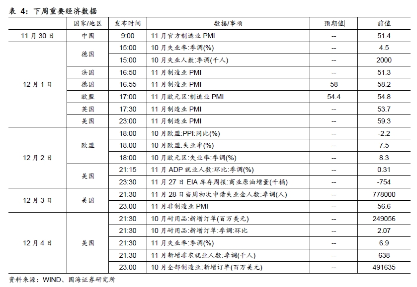 商品价格指数、石油期货价格均上涨。11月27日,南华工业品价格报2406.48点,较上周五上涨3.85%;RJ/CRB商品价格指数收于160.97点,较上周五上涨3.08%;11月27日,布伦特原油期货和WTI期货结算价分别报48.18美元和45.32美元,较上周五分别上涨7.16%和7.33%。
