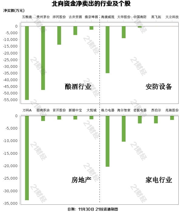 北向资金减持了29个行业,其中酿酒行业最多,净卖出金额达5.60亿元,其次是安防设备行业,净卖出4.07亿元。