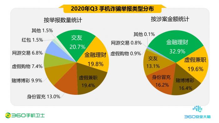 报告显示,2020第三季度(以下简称“三季度”)接到的手机诈骗举报中,交友占比最高为20.7%;其次是金融理财(19.8%)、虚假兼职(19.4%)、身份冒充(13.0%)、赌博博彩(9.9%)、虚假购物(7.4%)等。