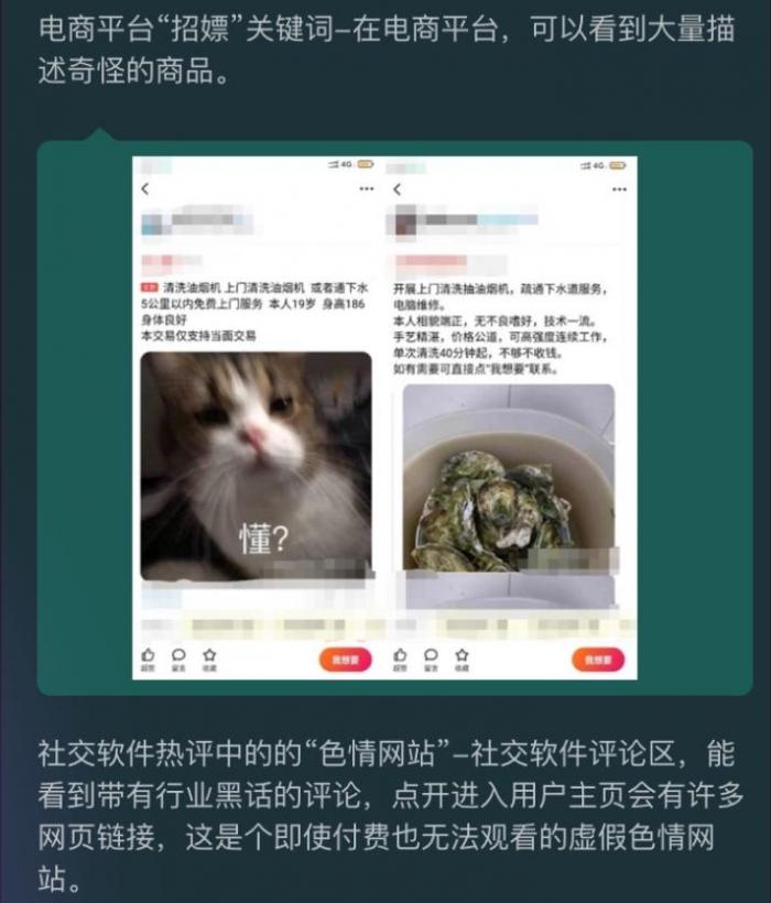 报告指出,正常使用电商平台的过程中并没有色情信息的存在,但如果使用了特殊的关键词,就会找到另一番天地。在某电商平台,使用关键词“清洗油烟机”,并将价格按照低价排序,可以看到大量描述奇怪的商品。