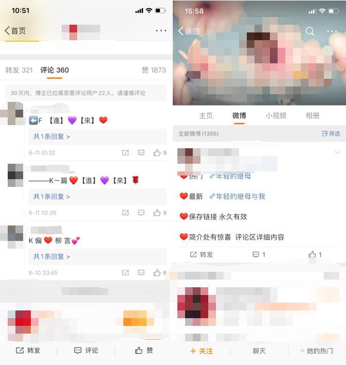 报告指出,浏览某社交软件评论区,能看到里面有带有行业黑话的评论,点开该评论用户的头像,进入用户主页,发现了许多网页链接,例如“年轻的继母”,访问的网站是个色情网站。