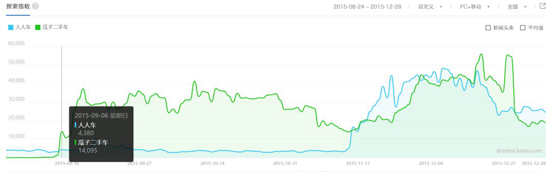 人人车确实被打的措手不及,当时其整个市场团队仅有三个人,导致人人车的跟进比瓜子晚了近三个月。正是在这三个月,瓜子的百度搜索指数首次超过了人人车,人人车的先发优势也在此后被逐渐抵消。