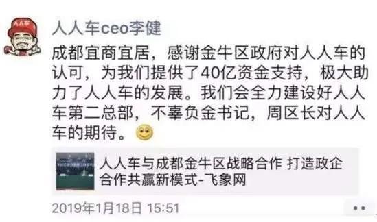 2019年1月21日,人人车在一份通稿中表示获得了来自政府的支持,宣布与成都市金牛区人民政府签订人人车运营投资总部项目合作协议,将在成都建第二总部。李健当时在朋友圈表示,金牛区政府提供了40亿资金支持。