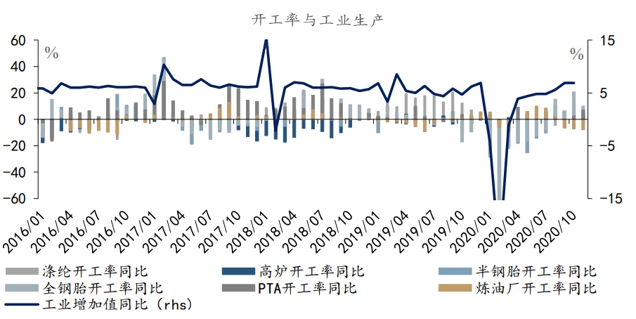 生产方面,整体回升。本周,汽车半钢胎、全钢胎开工率大幅回升0.7、1.8个pct;PTA开工率亦大涨2.1个pct,提示化工高景气度;螺纹钢库存去化力度减弱,高炉开工率走平;炼厂开工率亦与上周持平。