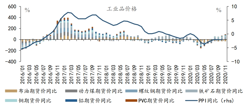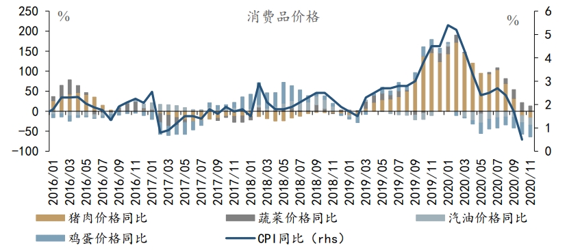 工业品价格,涨多跌少。供需预期改善,原油价格同比继续回升3.1个pct;库存低位,通胀预期提升,LME铜同比上涨2.9个pct;供暖需求推高动力煤3.1个pct;钢铁库存有所回升,螺纹钢同比下行0.6个pct;消费品价格方面,同比小幅回升。猪肉、鸡蛋、汽油价格同比跌幅收窄3.9、2.9和1.0个pct,收窄幅度变小;蔬菜价格同比降至10.6%,下行幅度扩大。