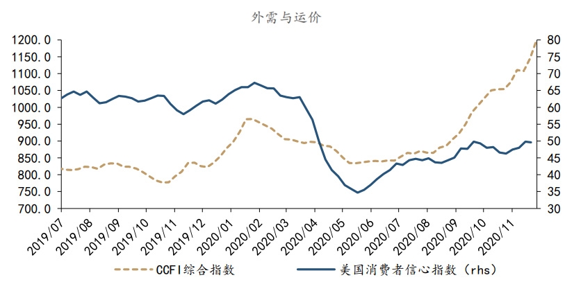 外需方面,出口继续改善。中国供给侧优势凸显,且集装箱周转仍偏慢,出口集装箱运价指数由1145.7 继续升至1198.7 ;供给侧限制仍存的同时,需求回升预期仍强,CRB现货指数周度同比由5.2%升至7.7%。