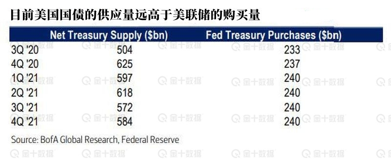 明年美国财政部将面临约2.4万亿美元的国债净发行量,可按照美联储当前的资产购买速度,美联储估计只能消化其中不到一半的美债(约9600亿美元)。