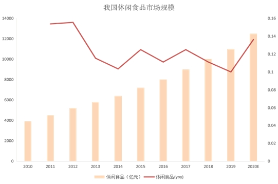 受新冠疫情的影响,人们在家中时间较长,对休闲食品的需求旺盛。根据食品伙伴网的数据,我国2020年休闲食品市场规模达到12500亿元,复合增长率达到13%以上。