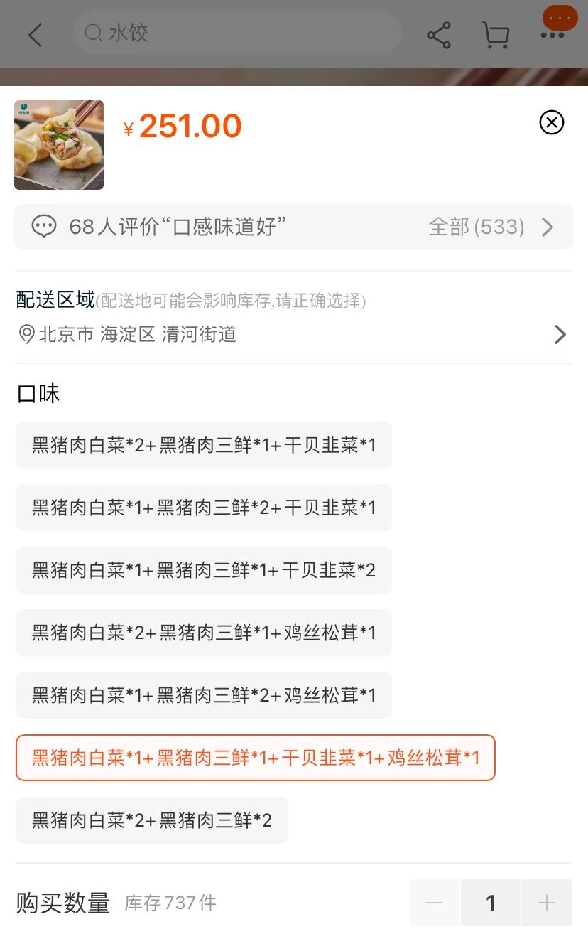 官方旗舰店价格251元,共4袋,分别为:黑猪肉白菜、黑猪肉三鲜、干贝韭菜和鸡丝松茸,每袋16枚饺子,共64枚,平均没枚饺子3.921875元。