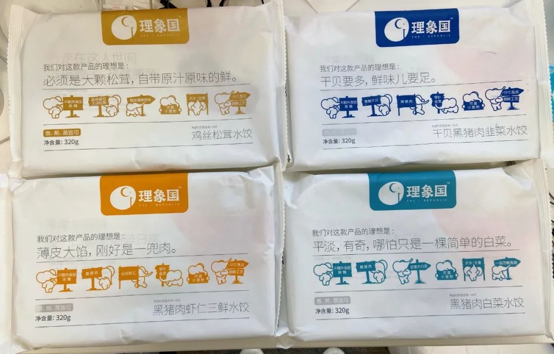 从理象国的产品包装中也可以看出,它其实也在突出自己社交货币的属性,比如被设计成“大象”形状的泡沫保温箱,自然联想到「理象国」的品牌名。另外,产品包装配色、文案设计和质感也都非常的上镜,怎么拍都很漂亮,加上3、4块钱的饺子价格,就非常能引起消费者分享欲,图片素材和文案都准备好了。