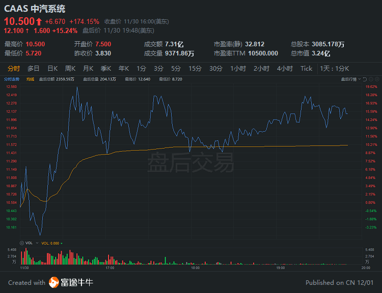 中概股中汽系统逆市暴涨174.2%!盘后续涨15%