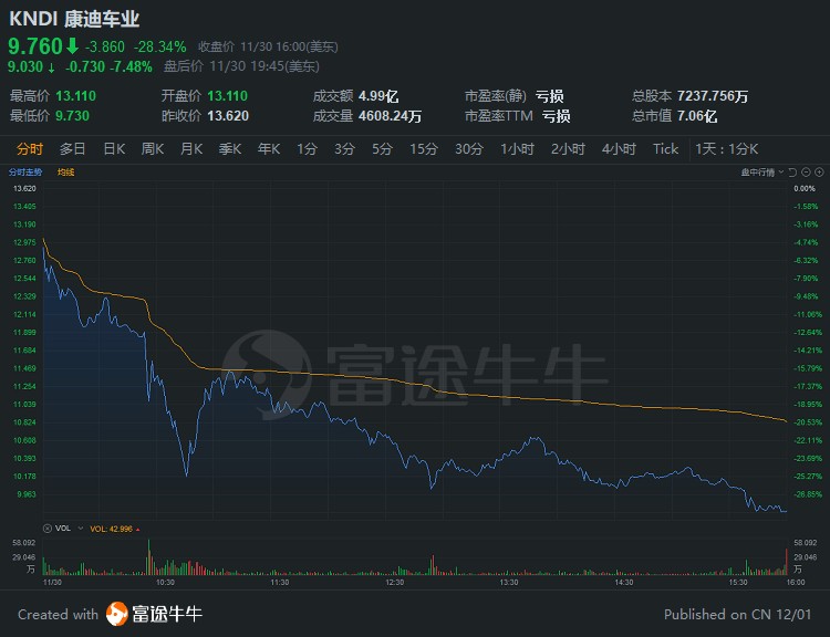 康迪车业被做空,股价一度暴跌近30%!电动车类中概股集体下挫