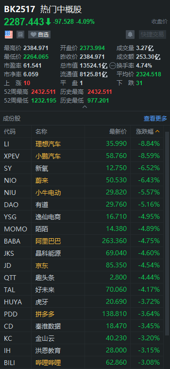 知名中概股中,阿里巴巴跌4.91%;百度跌0.31%;京东跌4.54%;网易跌3.18%;新浪跌0.05%;新浪微博跌1.99%;拼多多跌3.64%;趣头条跌4.44%;蔚来跌6.35%;理想汽车跌8.84%,小鹏汽车跌8.59%;爱奇艺涨1.59%;迅雷跌3.37%;陌陌跌4.89%;欢聚时代跌2.51%;虎牙跌3.68%;哔哩哔哩跌3.08%;汽车之家跌10.69%。