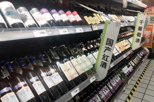 江苏常州,超市红酒专区销售的品牌国产干红葡萄酒。视觉中国