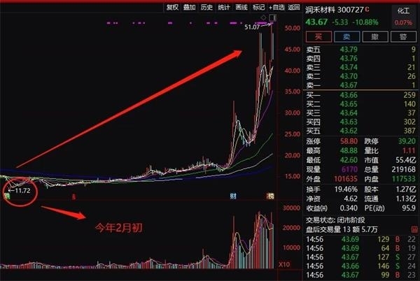 再往前拉升一点时间,润禾材料涨幅更大。从2月份股价底部11.72元(前复权),在12月3日该股最高冲至51.07元,股价涨幅高达3.36倍,后者是前者的4.36倍。