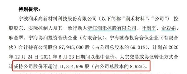 12月2日晚间,A股公司润禾材料公告,实控人及其一致性人人将大举减持。