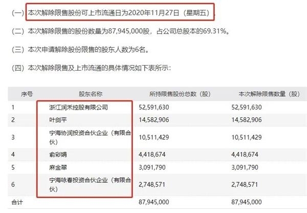 11月27日,润禾材料实控人叶剑平、俞彩娟及其一致行动人69.31%的持股,上市满3年解禁。就在这前后,公司股价异常暴动。