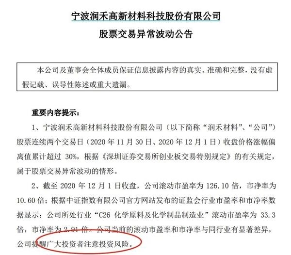 润禾材料表示,截至2020年12月1日收盘,公司滚动市盈率为126.10倍,市净率为10.60倍;根据中证指数有限公司官方网站发布的证监会行业市盈率和市净率数据显示:公司所处行业“C26化学原料及化学制品制造业”滚动市盈率为33.3倍,市净率为2.91倍。公司当前的滚动市盈率和市净率与同行业有显著差异,公司提醒广大投资者注意投资风险。