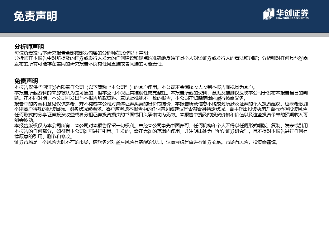 本资料来自华创证券研究所已经发布的研究报告,若对报告的摘编产生歧义,应以报告发布当日的完整内容为准。须注意的是,本资料仅代表报告发布当日的判断,相关的分析意见及推测可能会根据华创证券研究所后续发布的研究报告在不发出通知的情形下做出更改。华创证券的其他业务部门或附属机构可能独立做出与本资料的意见或建议不一致的投资决策。本资料所指的证券或金融工具的价格、价值及收入可涨可跌,以往的表现不应作为日后表现的显示及担保。本资料仅供订阅人参考之用,不是或不应被视为出售、购买或认购证券或其它金融工具的要约或要约邀请。订阅人不应单纯依靠本资料的信息而取代自身的独立判断,应自主作出投资决策并自行承担投资风险。华创证券不对使用本资料涉及的信息所产生的任何直接或间接损失或与此有关的其他损失承担任何责任。