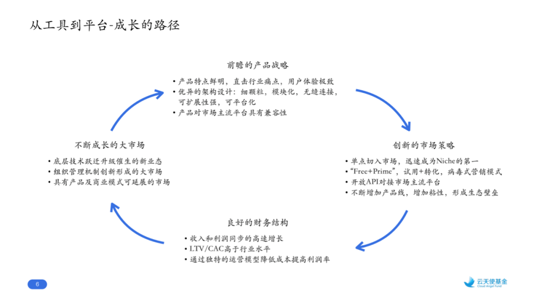 对于市场渗透,有两种做法,轻量级的产品用口碑传播,高度垂直行业主打标杆客户起到示范作用。在增长阶段,要先追求单产品市占率第⼀的销售策略,辅以⾏业⽣态伙伴战略,也就是和主流平台进行对接,最后扩展产品模块,丰富收费模式。
