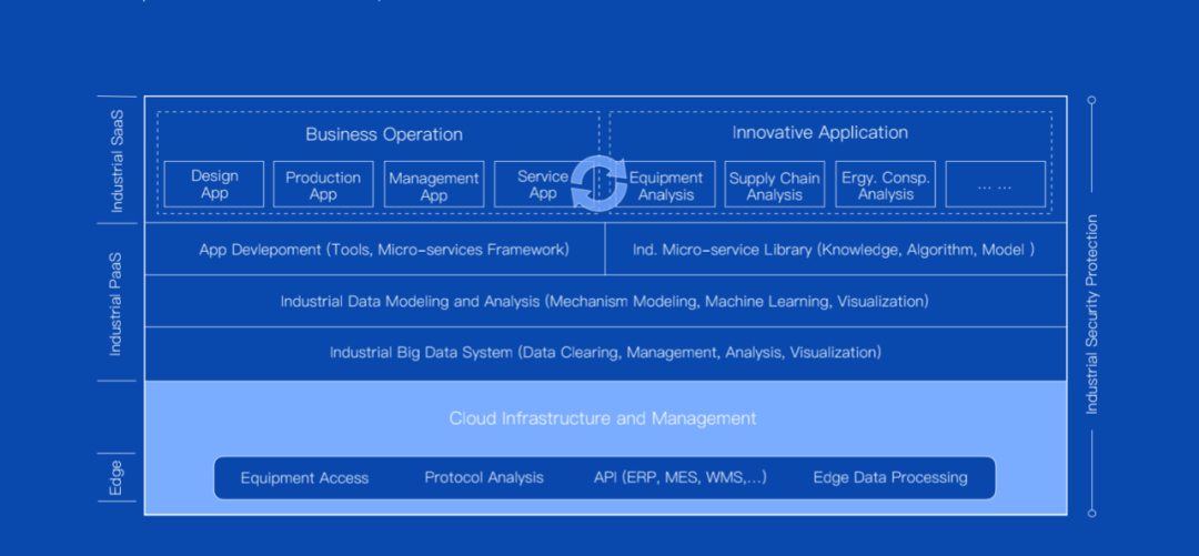 最底层是边缘层(接入层),主要做设备接入、协议解析、边缘计算和外部系统(ERP、MES、WMS)接入等;接入层之上是工业PaaS平台,作用是工业大数据清洗和分析、构建工业模型和分析模块,在这之上连接开发工具和微服务库两块,微服务库包括一些专业能耗、知识、算法和模型。