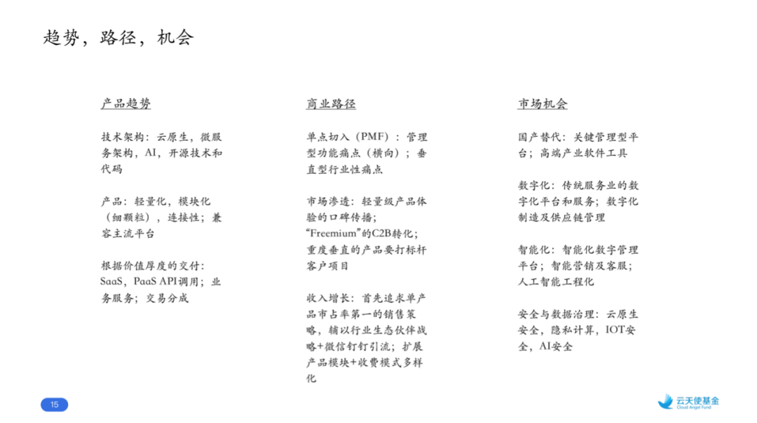从产品趋势上来看,首先技术架构的变化,这当中最明显的是云原生,因为当下很多软件系统和产品直接建立在云基础架构之上,再是微服务架构,这得益于现在企业对业务的灵活性和柔性化的要求;然后是AI技术的广泛应用,和公司对开源技术、代码的重视。