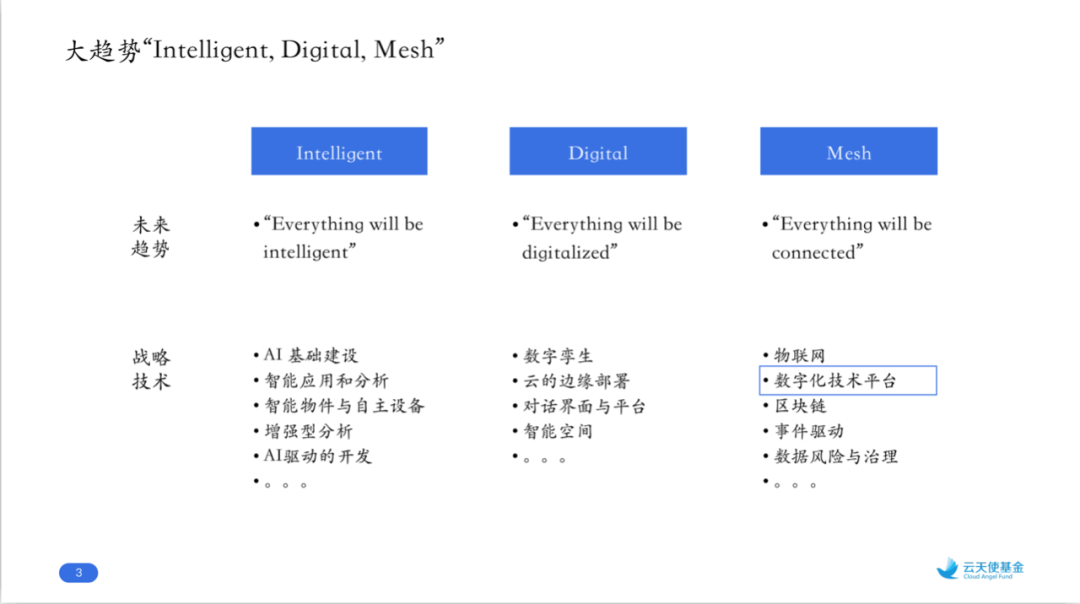 先说IT技术发展,当前我们正处在「Intelligent,Digital,Mesh」的时代。「Intelligent」指代智能化,未来人工智能会融合到所有技术之中,并建立自己的全新品类,我把它叫做:「Everything will be intelligent」,也就是说所有能被智能化的东西未来都会被智能化;