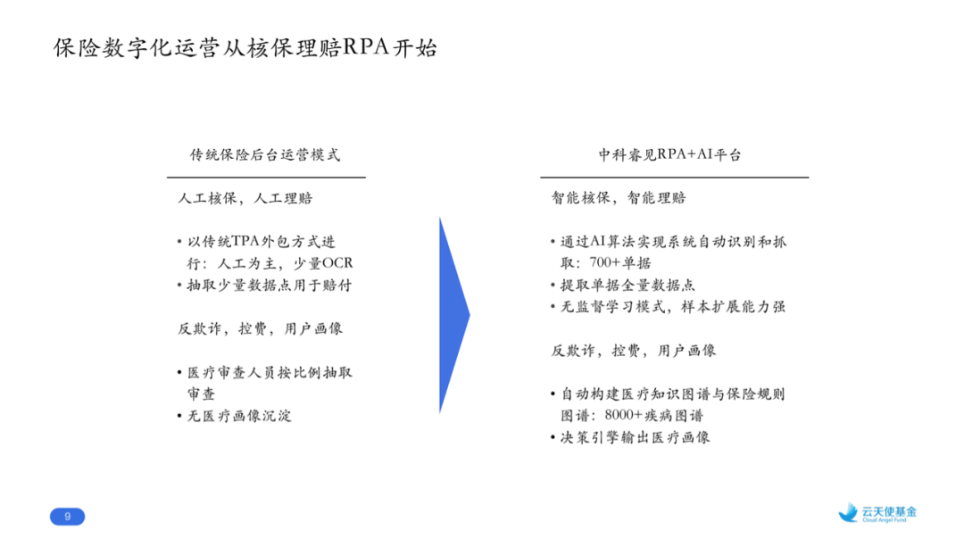我们投资的中科睿见运用大数据/人工智能技术为保险公司的运营提供了一整套解决方案,大大提高了保险的核保理赔效率,它们的人工智能算法可以实现保险单据的全量数据抓取和自动识别,准确率达到99.7%,超出了人类的识别水平,并通过RPA切入到整个理赔过程,另外通过实际的核保理赔数据对保险用户进行画像,到目前为止形成了八千多种疾病图谱。