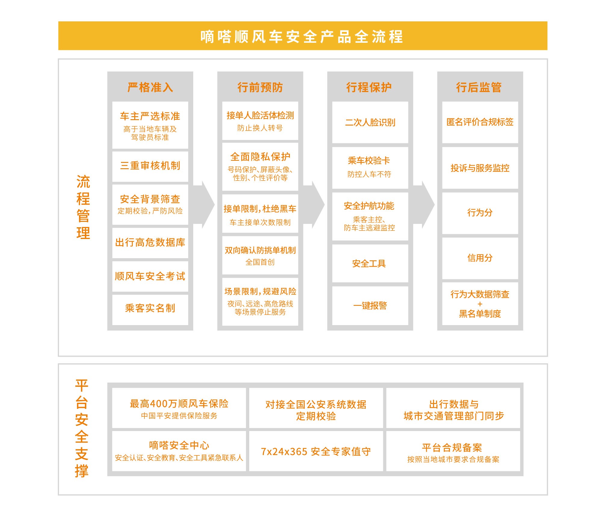 目前,嘀嗒出行已经构建起涵盖“五大模块、31项安全机制”严苛的安保体系,覆盖车辆准入、行前预防、行程保护、行后监管、平台安全支撑五大模块,拥有全国公安系统数据定期校验,出行数据与城市交通管理部门同步、安全背景筛查、出行高危数据库、行为大数据筛查+黑名单制度、全面隐私保护、双向确认防挑单机制、 安全护航功能、行程录音保护、路线偏移预警等31项安全机制,全面守护车乘安全。