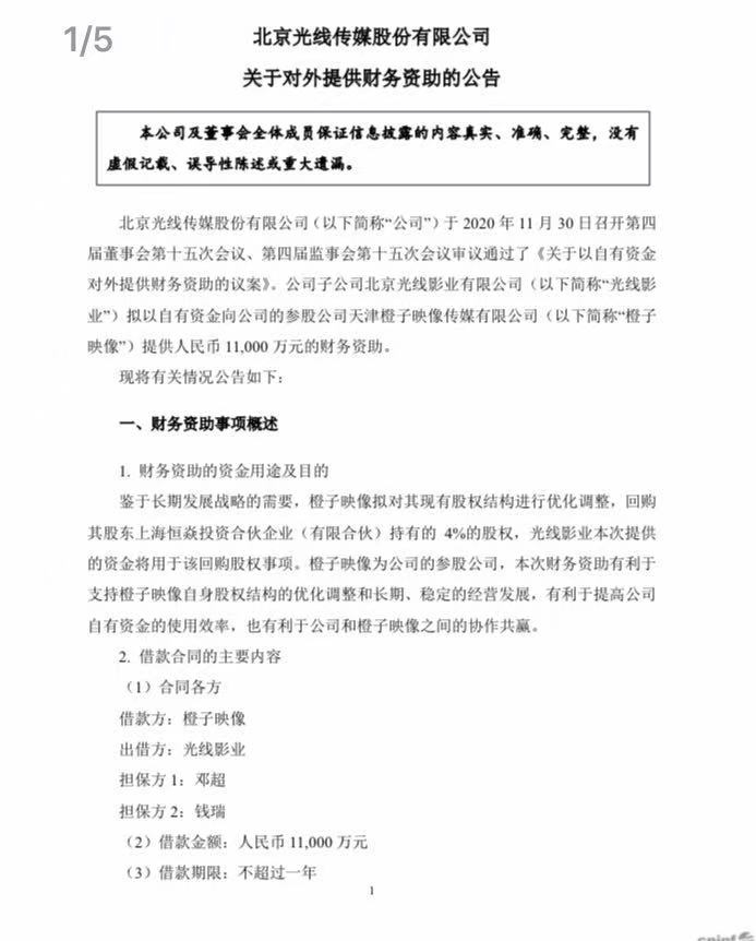 昨天(11月30日)光线传媒对外发布公告,光线传媒子公司光线影业,拟向天津橙子映像传媒有限公司(以下简称“橙子映像”)提供1.1亿元财务资助。而此次借款,橙子映像用来回购4%的股权,借款期限不超过一年,借款的年利率为8%。