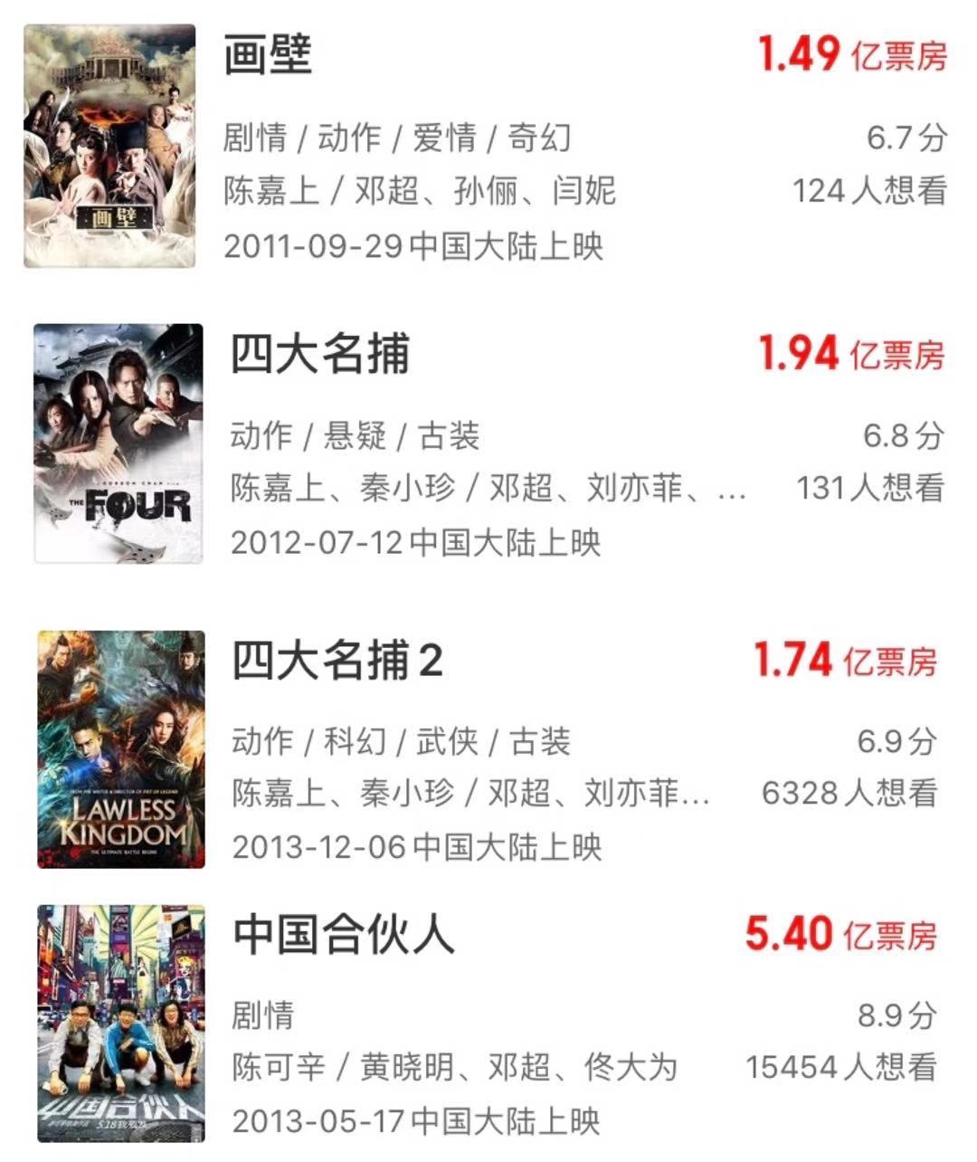 翻开邓超近10年来的片单,会发现邓超与光线传媒一直保持着稳定的合作关系。2011年-2013年,邓超尚未成立橙子映像,邓超接连主演了光线传媒出品的《画壁》《四大名捕1/2》《中国合作人》四部电影。