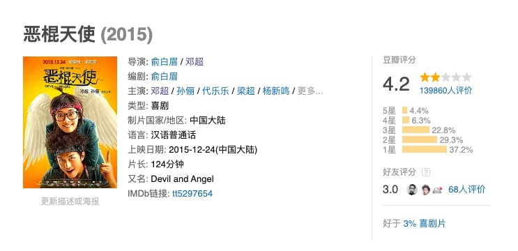 2015年邓超与俞白眉再次拍摄了第二部喜剧电影《恶棍天使》,邓超自导自演,搭档变成了因《甄嬛传》晋升为一线大花的孙俪,电影同样口碑扑街,毁誉参半,但依旧为光线传媒带来了6.48亿票房。