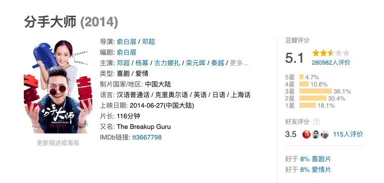 2014年,邓超开始进行转型,从演员转向导演领域,橙子映像也开始产出电影作品,光线传媒承担起了邓超与橙子映像背后的支撑者的角色。这一年,光线传媒出品了邓超与俞白眉合作导演的首部喜剧电影《分手大师》,邓超自导自演,还拉来了当时正在流量爆发口的杨幂做配,虽然电影口碑扑街,豆瓣评分仅5.1分,但是为光线传媒带来了6.65亿票房。