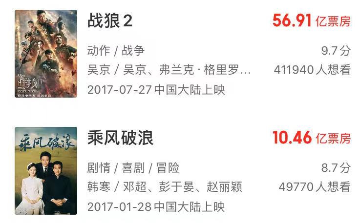 这一年邓超主演的春节档电影《乘风破浪》,橙子映像作为主要出品方之一,但是却未看见光线传媒的影子。同年暑期档,橙子映像作为出品方押中了最大爆款《战狼2》,而光线传媒并未参与电影出品。