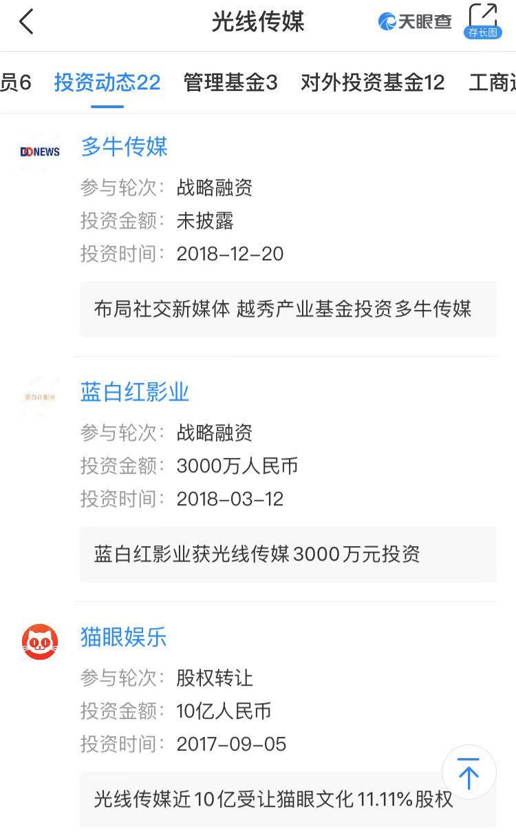 目前天眼查数据显示,光线传媒公开投资事件达到64件,未公开投资为42件,整体投资事件超过100件。在第33届中国电影金鸡奖中国电影投资大会·高峰论坛上,《中国电影投融资报告》显示,光线传媒投资了猫眼娱乐、可可豆动画、新丽传媒等13家影视公司,仅次于腾讯投资与厚德前海基金。