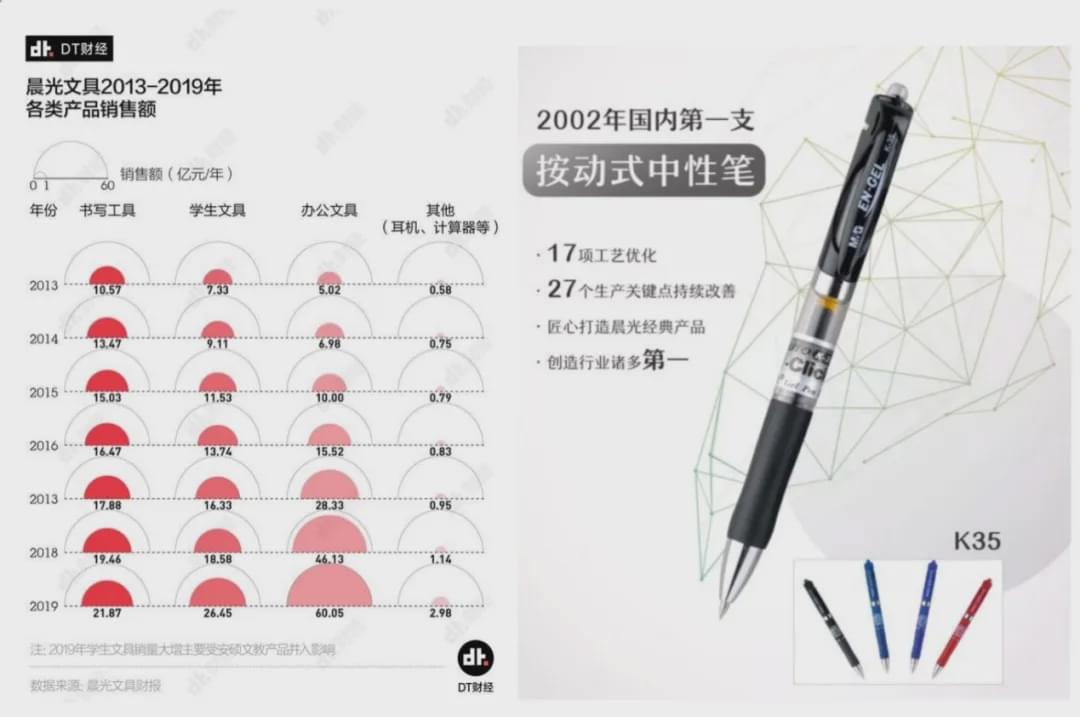 要把笔的球珠做到0.38毫米这是一个技术含量很高的事情,笔的生产设备的精密程度和生产一款欧米伽手表是一样的。晨光创立了世界上独树一帜的生产研发体系,对基本款进行大规模自动化生产。而对各种主题创意的产品选择灵活快速的小规模,半自动化生产。在质量和价格的中间地带,晨光吃到了巨大的市场红利,逐渐进入到行业龙头的位置。
