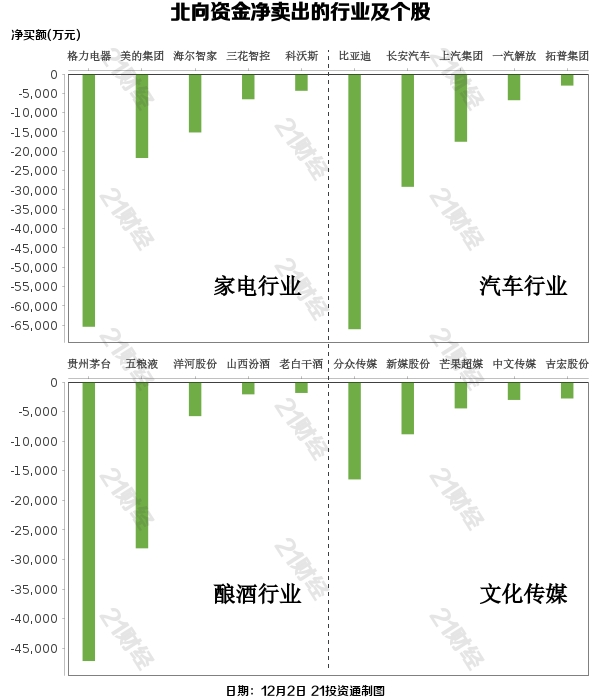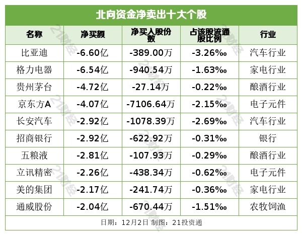 北向资金净卖出比亚迪(002594.SZ)、格力电器(000651.SZ)、贵州茅台(600519.SH)、京东方A(000725.SZ)、长安汽车(000625.SZ)居前,其中,比亚迪被净卖出6.60亿元,格力电器被净卖出6.54亿元,贵州茅台被净卖出4.72亿元,京东方A被净卖出4.07亿元,长安汽车被净卖出2.92亿元。